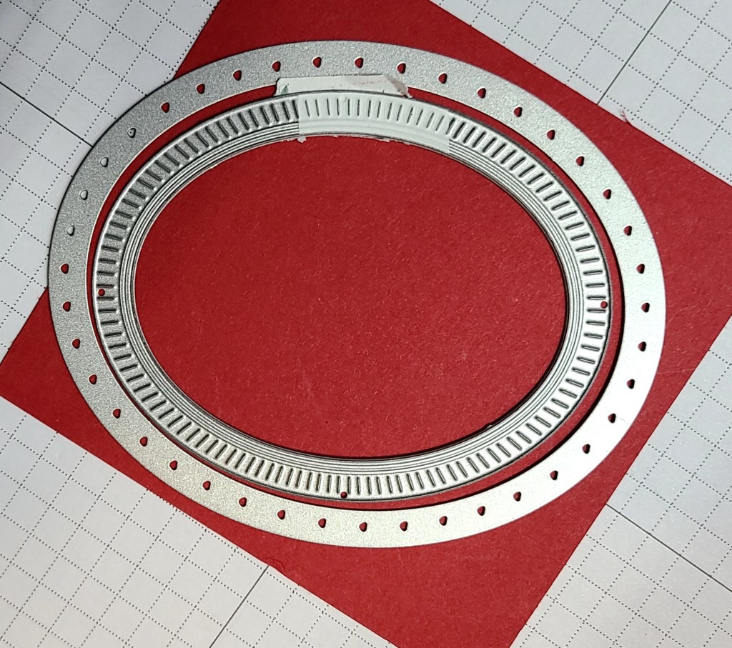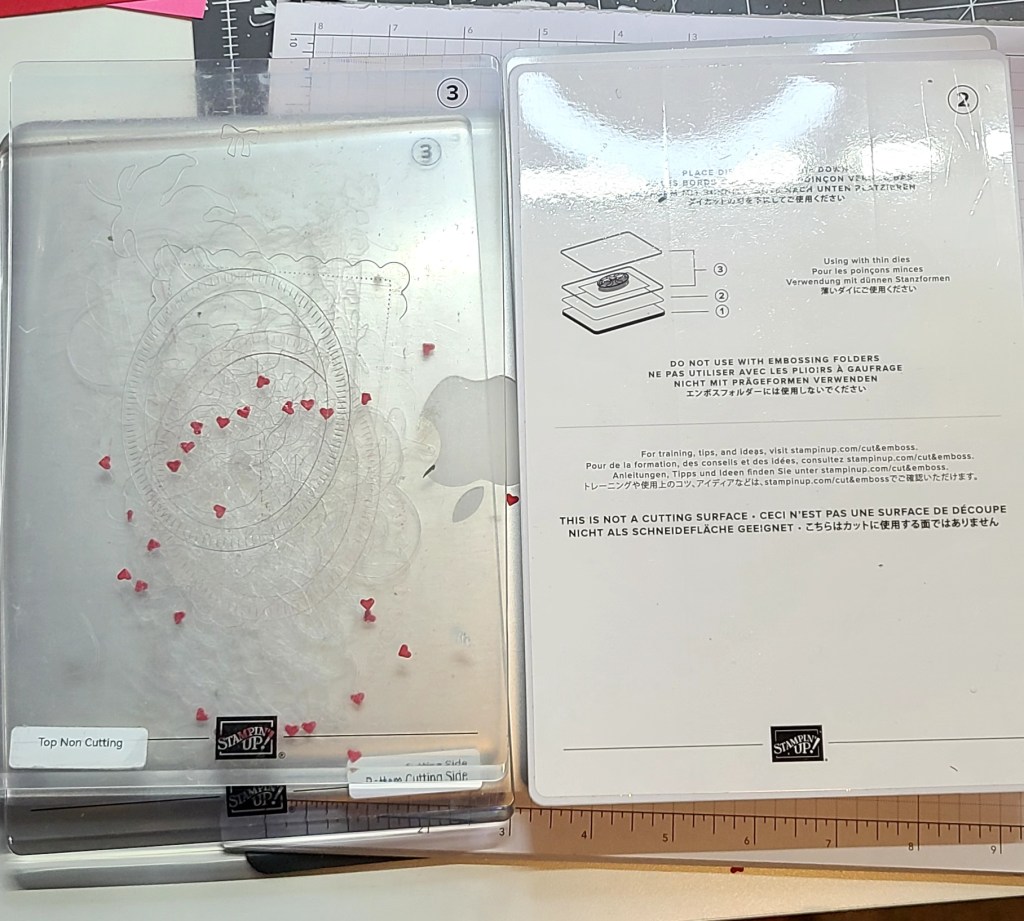 • Take your Real Red CS piece and your Framed Florets die with the hearts around the edges, center the die, secure with Labeling Tape, if needed, and cut using your Cut and Emboss Machine. Do the same using the other oblong frame to cut out the middle. Be sure to center and secure the die so it cuts evenly. This can be done with one cut only instead of two, if you feel confident.