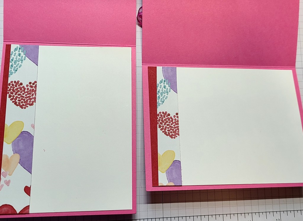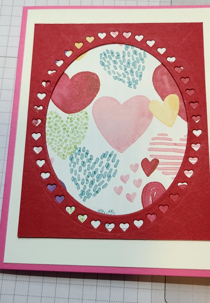 • Now cut out a Polished Pink heart and a Basic White one using a punch or fussy cutting it. With dimensionals, attach both over the red layer off to the side (see pics).