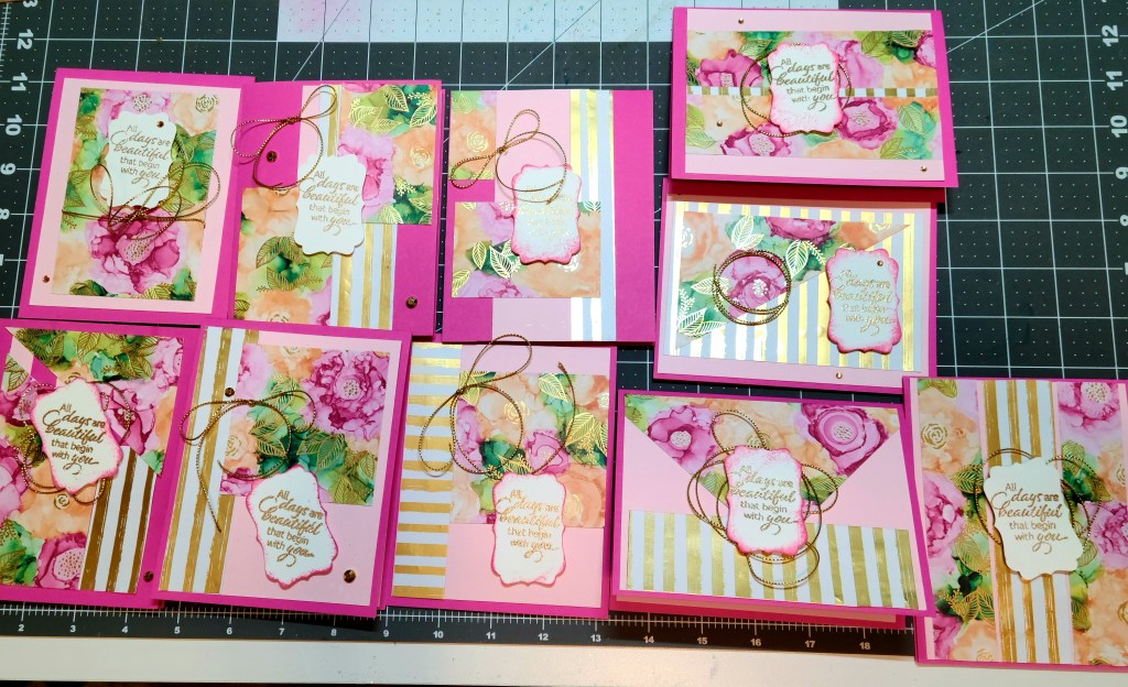 Tonight’s challenge was one I always enjoy. I needed to make ten cards using pieces from one sheet of 12″ by 12″ Designer Series Paper. I chose a sheet of Expressions in Ink DSP for it gorgeous pink tones and gold foils. I used gold ribbon, gold embellishments, and gold heat embossing powder to give the cards some bling. I was very happy with how they turned out. Here are the cards and supplies used.