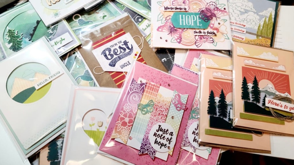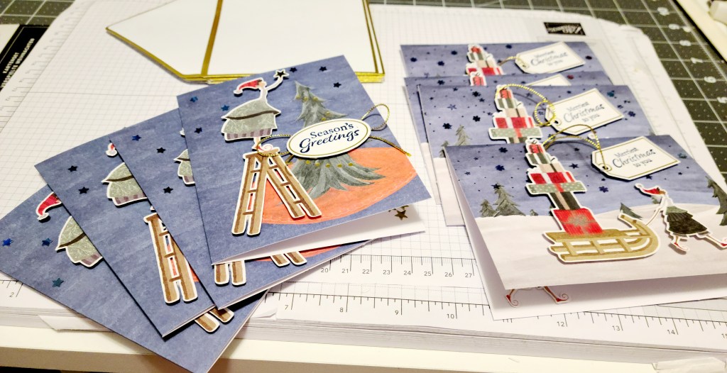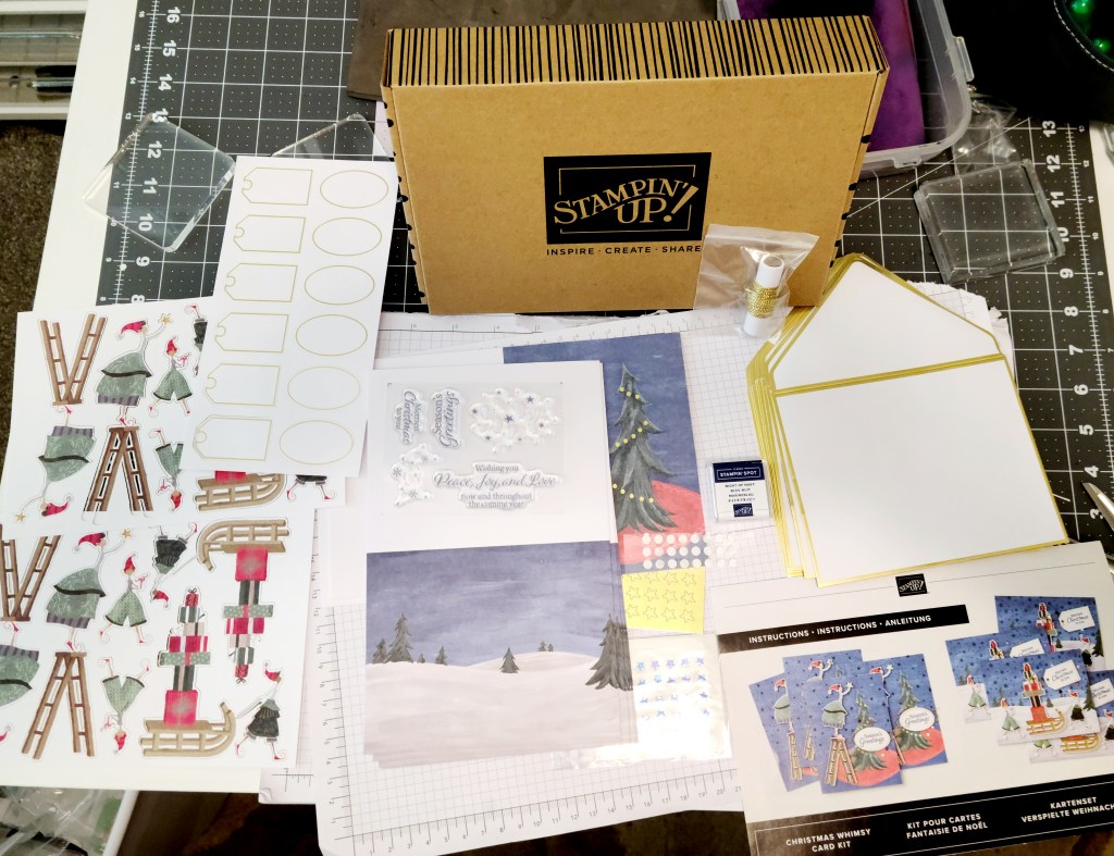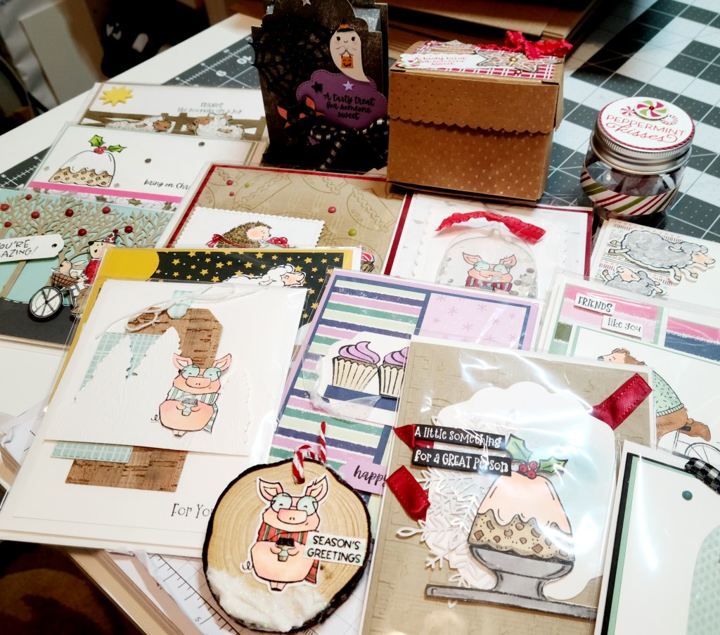How fun! My team leaders, Di and Marcy, held a Fall Social last Saturday. It was virtual and here is how it works. You sign up to participate about two months before. Di and Marcy pick three current stamp sets and create several projects for us to do. They ship our box of supplies ahead of time, create a PDF with instructions and pictures of the finished projects, and we all meet for further instruction and social time. I’m certain it’s a lot of work to put these things together, but they do a magnificent job! The three sets we used this time were Counting Sheep (Sale-a-bration), Sweets and Treats and Joyful Life, both from the July through December Mini Catalog. We made adorable cards and treat boxes!