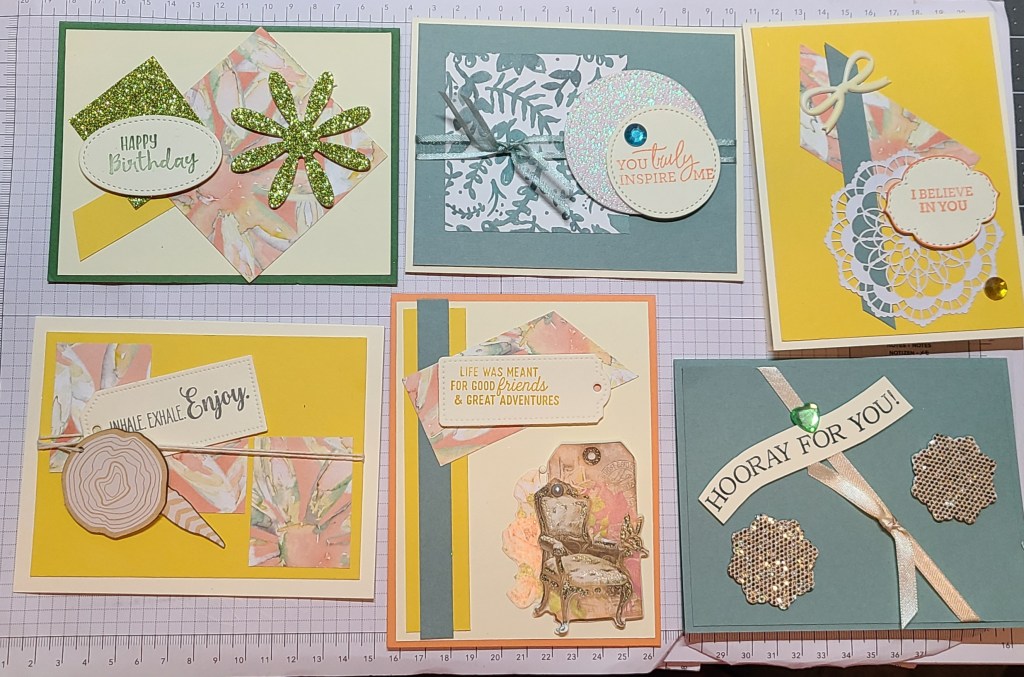 The SixI used Vanilla, Daffodil Delight, and blue against the Grapefruit Grove on this one. I love the subtle colors in the DSP. The sticker is not from SU!I used Vanilla, Daffodil Delight, and some green glitter paper from SU, again to go with the subtle DSP. I also used the Daisy Punch.Daffodil Delight and blue against the DSP and Vanilla base. The SU! doily embellishment also added a little subtle touch. The bow and yellow dot are not from SU!I used Daffodil Delight and DSP against the Vanilla card base again here. The twine and embellishments are both from SU!This is the other side of the DSP, which is why I wanted to incorporate some blue. I used this against the Vanilla card base and used SU! glitter paper and ribbon. The blue dot is not from SU!I used a few of the products I had leftover from the kit, but didn’t feel I could do much with this card. The ribbon and doily punch along with paper is from SU! The green heart is not.