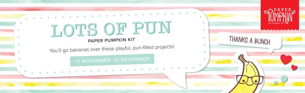 December’s Paper Pumpkin is Lots of Pun. Remember, our monthly craft project can be subscribed to by the 10th of each month. You may order and pay monthly, or save with prepaid subscriptions for three, six, or twelve months. They are great fun for the beginner, casual, or avid stamper. Go Here to order.